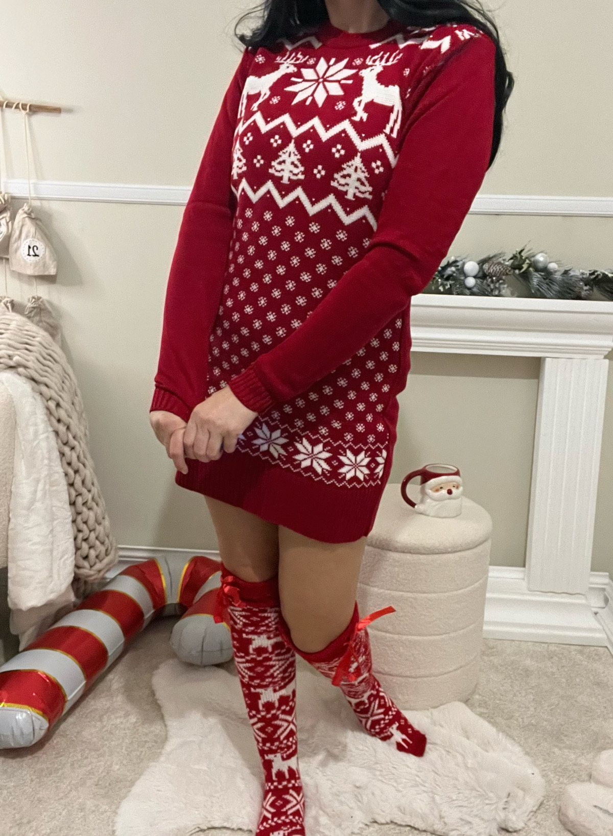 Pletena haljina dugih rukava s božićnim motivom, savršena za nadolazeće svečane dane i još mnogo toga. Haljina od struka nadolje ističe ženske prednosti, a materijal od kojeg je izrađen osigurat će udobnost nošenja i dodati šarm.